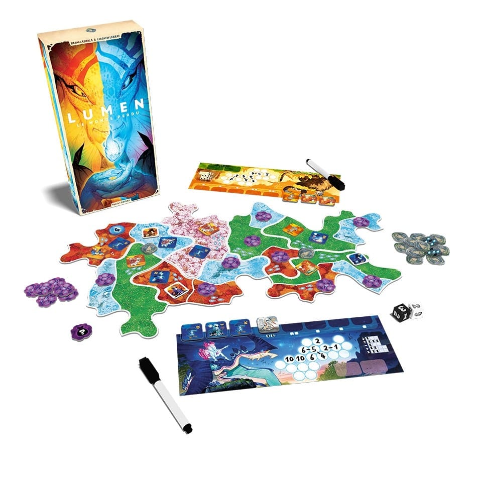 LUMEN apporte une expérience d’affrontement à 2 joueurs dans laquelle il faudra développer son armée de combattants du Monde Perdu (Peuple du Jour vs Peuple de la nuit) afin de récupérer un maximum de Lumens en contrôlant des territoires ainsi qu’en remplissant des objectifs propres aux scénarios. Chaque scénario renouvelle l’expérience avec une mise en place et des bonus différents. La mécanique de Roll and Write issue de TREK 12 est uniquement utilisée pour le recrutement de nouveaux combattants et/ou l’obtention d’ordres à donner à ses combattants sur le plateau. En fin de partie, elle n’apporte aucun point : tout se passe sur le plateau. Une double lecture de jeu est nécessaire et apporte une profondeur à la mécanique qui le classe parmi les jeux experts.
