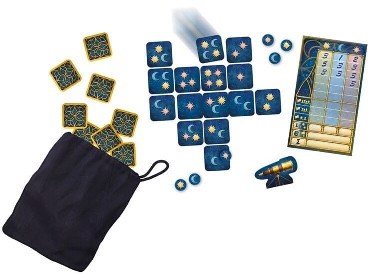 Votre objectif est de former des carrés de 4 tuiles pour créer des constellations. Mais attention, seuls les symboles les moins présents dans chaque constellation contribuent à votre score. Soyez stratégique dans vos choix pour maximiser vos points tout en bloquant les options de vos adversaires.