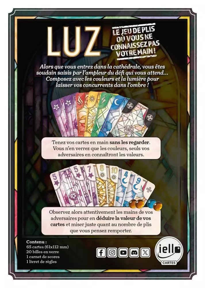 Entrez dans la cathédrale, ressentez l’ampleur du défi : Luz est un jeu de plis original et ingénieux, où chaque joueur tient ses cartes en main sans jamais voir leurs valeurs. Vous ne percevez que leurs couleurs, tandis que vos adversaires, eux, savent exactement ce que vous détenez.