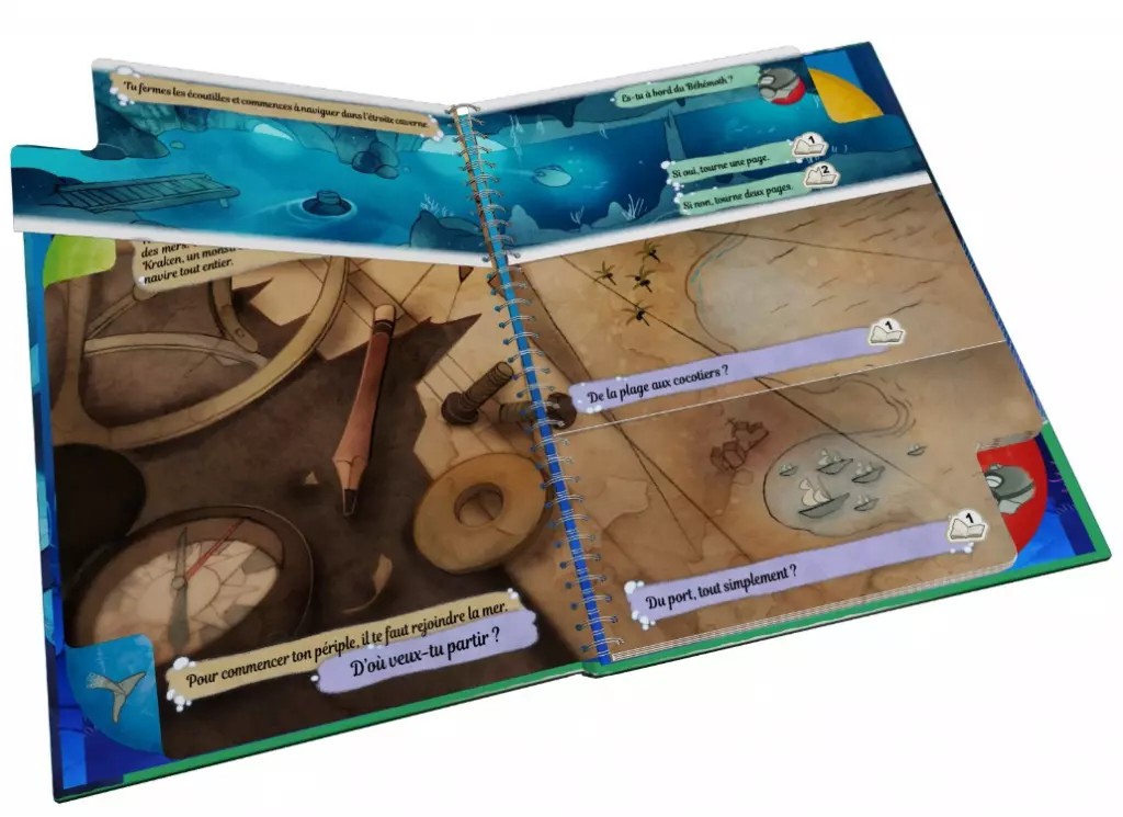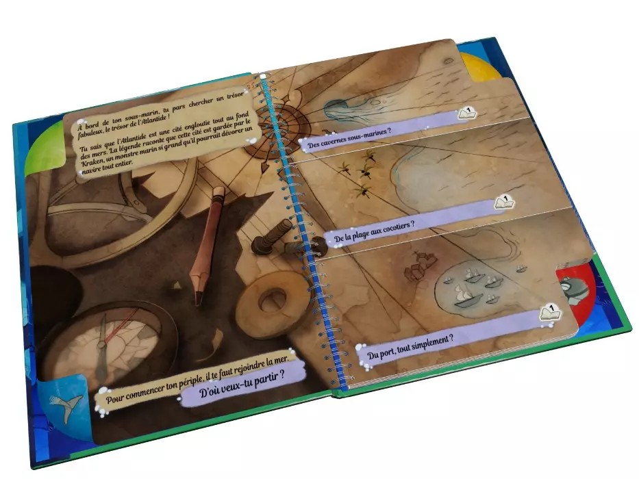 Un livre interactif qui change à chaque lecture L’histoire se lit de manière classique, mais à certains moments, des pages coupées en trois permettent aux enfants de faire des choix. En tournant la partie de page de leur choix, ils découvrent une nouvelle tournure à leur aventure. Ces décisions les conduisent vers des chemins uniques et multiples fins. Les jeunes explorateurs peuvent ainsi revenir et choisir de nouveaux parcours ou essayer avec un autre sous-marin pour découvrir toutes les possibilités !