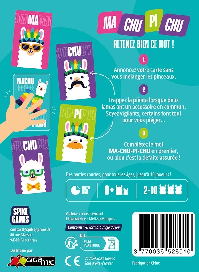 Rapidité, observation et bonne humeur sont au programme dans ce jeu pour 2 à 10 joueurs dès 8 ans. Simple, fun et idéal pour des soirées animées entre amis ou en famille, Machu Pichu garantit des éclats de rire à chaque partie.