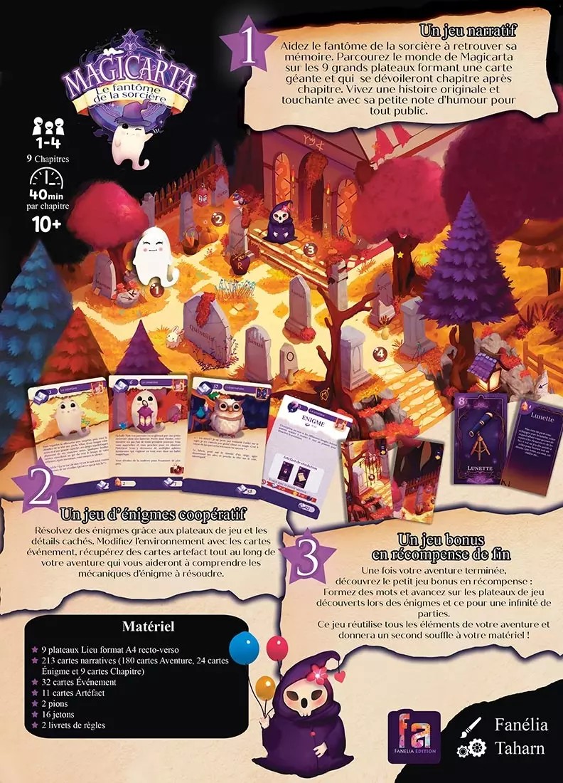 Dans Magicarta, incarnez le fantôme d’une sorcière cherchant à retrouver sa mémoire en explorant un monde mystérieux rempli d’énigmes et de découvertes. Résolvez des casse-têtes captivants, manipulez l’environnement avec les cartes Événement et découvrez des artefacts révélant les secrets de votre passé. Grâce aux 9 plateaux évolutifs, l’histoire se dévoile chapitre après chapitre pour une expérience riche en surprises et rebondissements. Une fois l’aventure terminée, profitez d’un jeu bonus qui donne une seconde vie à votre matériel.