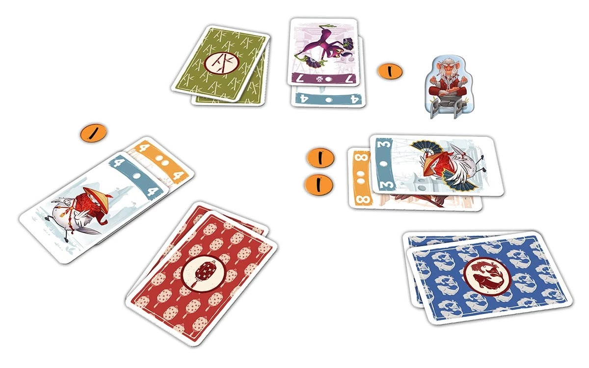 Chaque joueur dispose d’un paquet de cartes ninjas numérotées de 1 à 8, réparties en trois couleurs. À chaque tour, tous les joueurs jouent deux cartes, l’une après l’autre, en les disposant en colonne devant eux. Une fois les cartes révélées, on compare les valeurs les plus élevées jouées dans chaque couleur, selon un ordre précis.