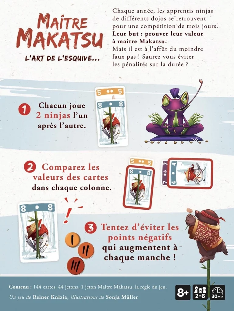 Maître Makatsu est un jeu d’ambiance malin qui récompense la ruse, le sang-froid et le sens du timing.