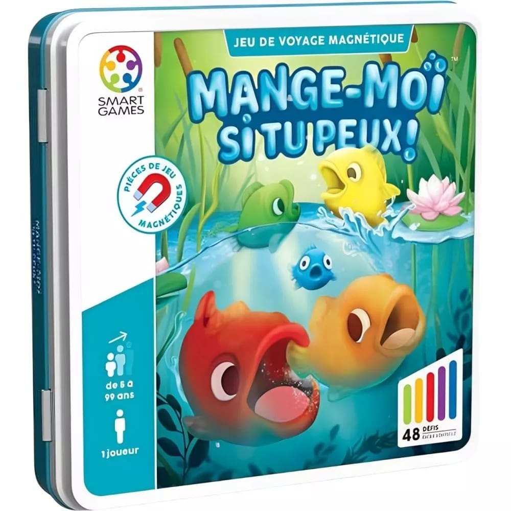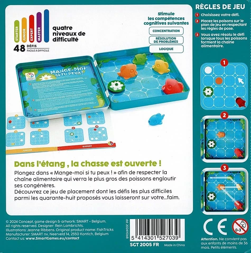 Dans l’étang, la chasse est ouverte ! Mange-moi si tu peux ! est un jeu de logique pour un joueur, proposant 48 défis répartis en 4 niveaux de difficulté. Ce jeu magnétique de voyage vous invite à respecter la chaîne alimentaire en positionnant correctement les animaux sur le plateau en fonction des indications fournies.
