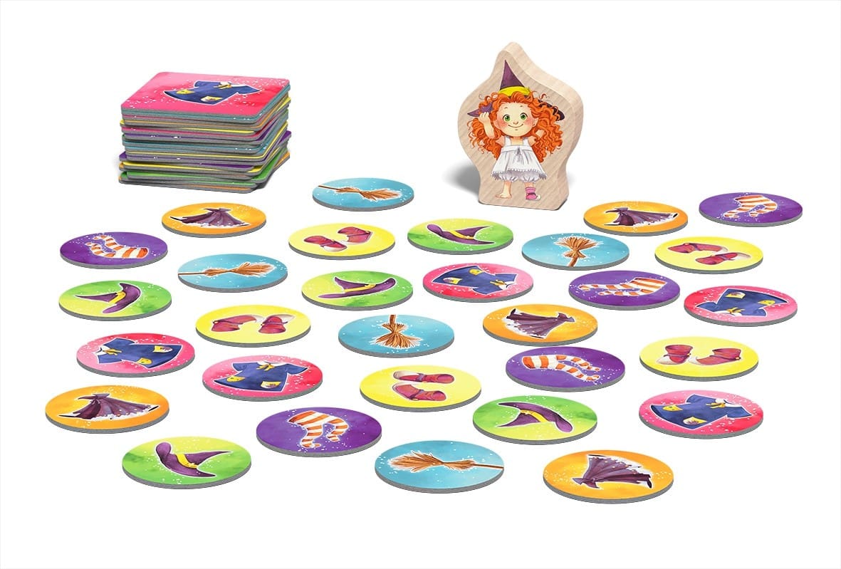Simsalapouf ! Marie, la magicienne maladroite, a enchanté ses vêtements par accident. Maintenant, elle a besoin de votre aide pour les retrouver. Placez toutes les tuiles vêtements au milieu de la table et mélangez les cartes de recherche pour former une pioche face visible.