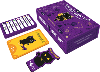 Maudit mot dit est un jeu original ou chacun va devoir faire deviner un mot, sans qu’il soit trouvé trop tôt. Dans ce jeu de déduction où il faut sans surprise deviner un mot, tout se joue sur le nombre d’indices… ni trop, ni trop peu… Maudit Mot Dit est un jeu plein de malice. Chacun va devoir faire deviner un mot… sans qu’il soit trouvé trop tôt ! D’abord un joueur ouvre la boite et découvre un mot à faire deviner avec un nombre précis d’indices. Grâce à des associations d’idées plus ou moins évidentes, il donne des mots indice un par un… Le joueur doit donner le bon nombre d’indices, ni plus, ni moins, et si un adversaire devine le bon mot trop tôt, il lui vole les points… Exemple à 3 joueurs : Irma essaye de faire deviner le mot secret Poisson en 4 indices. Après avoir dit “Astrologie” et “Lune”, elle dit ” Queue” en 3e indice. Félix propose Poisson, la manche s’arrête immédiatement et lui seul gagne 3 points ! Mauvais sorts et Malédiction inclus, pour le plaisir de se faire des ennemis ! Saurez-vous tourner autour du mot ?