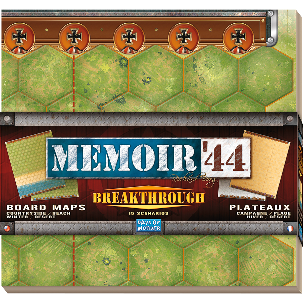 L’extension Plateaux Breakthrough pour Mémoire 44 vous fera découvrir de grandes opérations de la Seconde Guerre mondiale sous un nouveau jour. Vous y trouverez deux plateaux grand format double-face, de 13 hex par 17, avec lesquels vous pourrez jouer des batailles à grande échelle sur n’importe quel terrain (campagne, plage, hiver et désert) ! Ces plateaux sont composés de 9 panneaux et ont été imprimés à la plus grande taille que le permettent les technologies d’impression actuelles. Le format Breakthrough s’ouvre ainsi à de nouveaux scénarios ! 15 scénarios, pour la plupart inédits, sont inclus dans cette extension. Ils sont l’œuvre de Jacques « jdrommel » David et de Richard Borg, l’auteur de Mémoire 44. Des bocages de Normandie aux atolls du Pacifique, en passant par le désert d’Afrique et les steppes de Russie, ces scénarios couvrent de multiples théâtres d’opération et retranscrivent de célèbres batailles comme l’Opération Crusader, l’Opération Amherst, ou encore le Débarquement de Sword Beach, fourni en deux versions différentes.