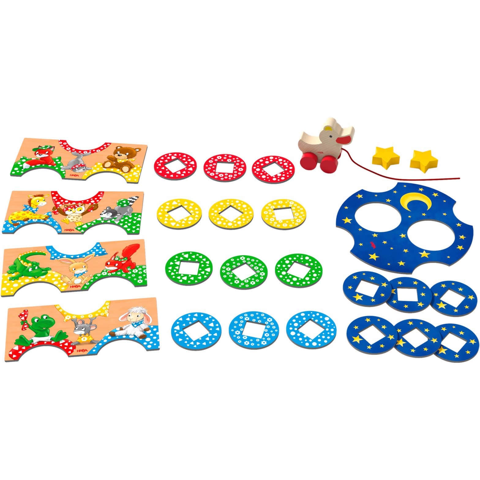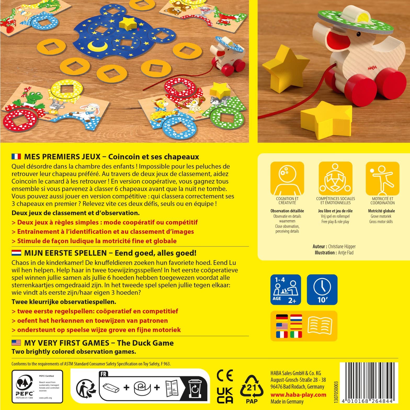 Le contenu du jeu est soigneusement conçu pour stimuler les compétences des enfants. Il comprend un petit canard en bois à tirer (Coincoin), 5 plateaux de jeu, 2 étoiles en bois, 18 tuiles (12 chapeaux à motifs et 6 motifs étoilés), et une règle du jeu. Les règles sont simples à comprendre, ce qui en fait un excellent choix pour les enfants de tous âges.