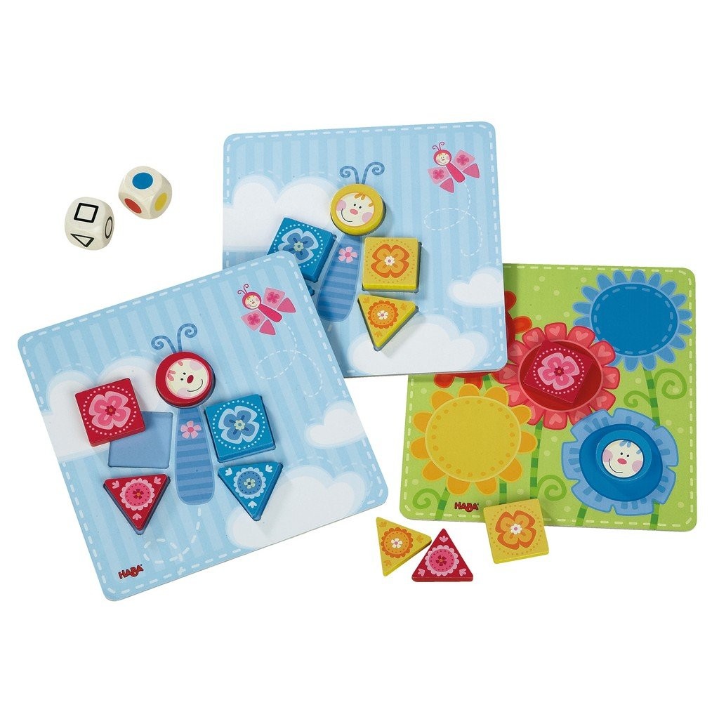 D’abord lancer le dé, ensuite chercher la forme ou la couleur correspondante et la poser au bon endroit sur le plateau de jeu ? et voilà un resplendissant tableau de fleurs et de papillons.
