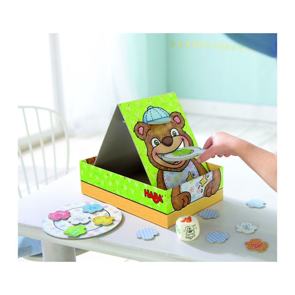 Le petrit ours a une faim de loup ! Heureusement qu’une assiette pleine de bouillie est déjà prête. Le dé va indiquer aux enfants par quelle bouillie ils vont commencer à donner à manger au petit ours. Qui veut donner à manger au petit ours en premier ?