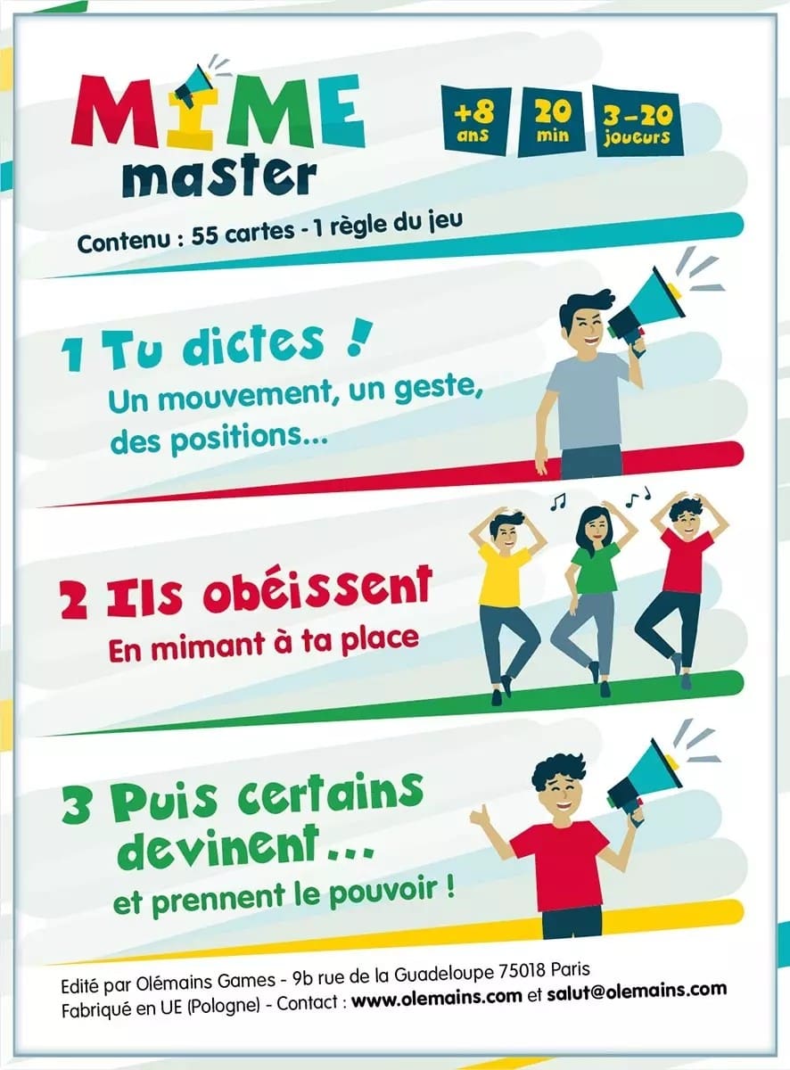 ? Devenez le Mime Master ! Un joueur pioche une carte avec un mot ou une expression à faire deviner. Mais attention : interdiction de mimer ou de prononcer le mot ! Votre seul pouvoir ? Donner des instructions précises pour guider les gestes et les postures des autres joueurs.