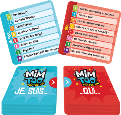 Mimtoo Pop culture est LE jeu de mimes coopératif qui vous entraîne au bout de la nuit : jouez tous ensemble en 15 minutes et tentez de (faire) deviner le plus de cartes possibles !