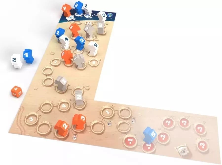 Le plateau comporte trois bornes qui déclenchent de nouvelles règles au fil de la partie. Vous pourrez scinder vos déplacements pour bouger deux pions à la fois et créer des chaînes d’astronautes qui vous permettront de relancer le dé ! Chaque décision compte : faut-il avancer vite ou préparer un enchaînement spectaculaire ?