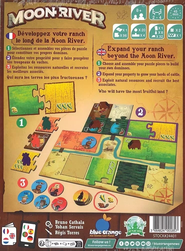 Dans le jeu Moon River inspiré du Kingdomino, à vous d’assembler vos parcelles de la façon la plus astucieuse afin d’y faire prospérer vos troupeaux, créant ainsi un ranch légendaire. Au lieu de placer des dominos dans votre paysage comme avec son « jeu « aîné, le jeu utilise des demi-dominos dont un bord a une connexion de type puzzle. Vous combinez deux de ces demi-pièces de puzzle pour créer vos propres dominos. Assemblez vos parcelles pour constituer chacun de vos dominos. Agencez-les pour créer votre ranch. Développez vos troupeaux et exploitez le mieux possible vos terres pour cumuler un maximum de points