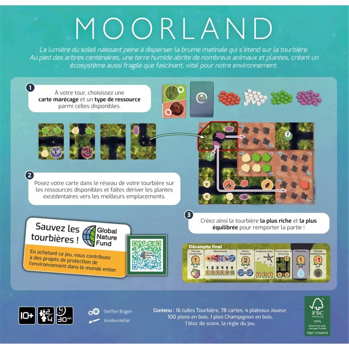 Moorland est un jeu de stratégie où chaque décision compte. Les joueurs doivent anticiper les besoins futurs de leur écosystème, planifier leurs actions en conséquence et s’adapter aux changements de conditions pour maintenir un équilibre harmonieux. La compétition est féroce pour créer la tourbière la plus prospère.