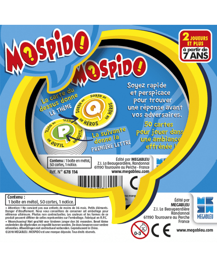 La boîte Mospido comprend une notice détaillée pour une prise en main rapide, ainsi que 50 cartes soigneusement rangées dans une boîte métallique. Les cartes présentent une diversité de thèmes et de lettres, assurant une expérience de jeu renouvelée à chaque partie.