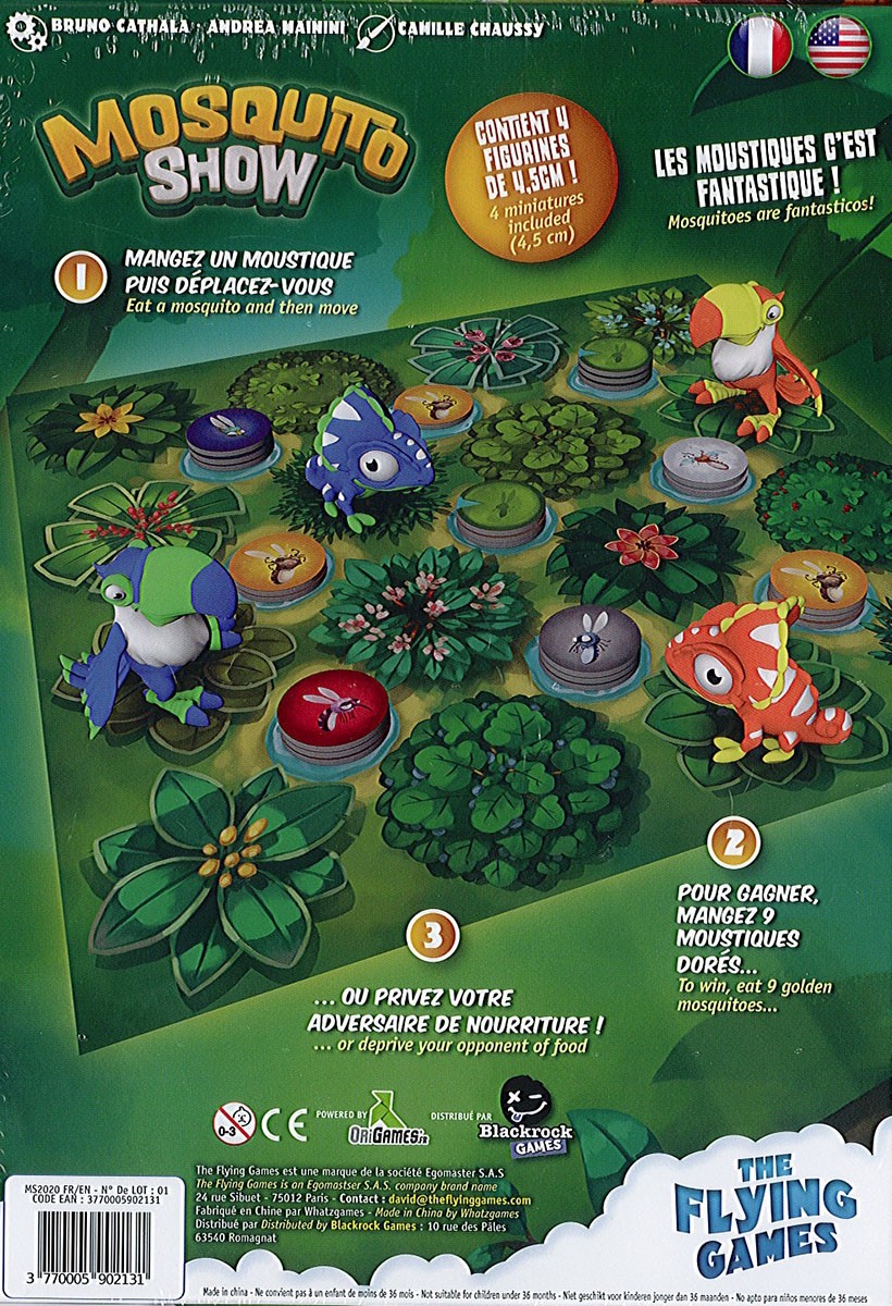 La jungle est le théâtre de la compétition intense entre Toucans et Caméléons dans Mosquito Show, un jeu de plateau rapide conçu pour deux joueurs. La quête de nourriture tourne autour des Moustiques, en particulier les précieux Moustiques dorés, au goût intense et très recherchés.