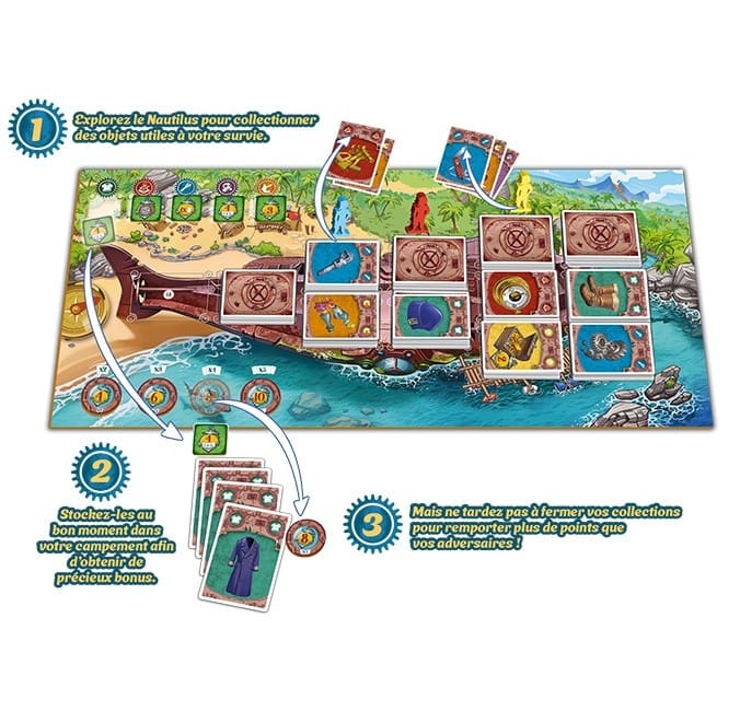 Nautilus Island est un jeu de stratégie passionnant qui combine l’exploration, la gestion de ressources, et la compétition entre joueurs. Votre objectif ultime est de quitter l’île en réparant le Nautilus et en obtenant le plus de points possible. Le destin des naufragés dépend de vos décisions et de votre capacité à anticiper les actions de vos adversaires. Êtes-vous prêt à explorer Nautilus Island et à surmonter les défis pour assurer votre survie et votre victoire ?