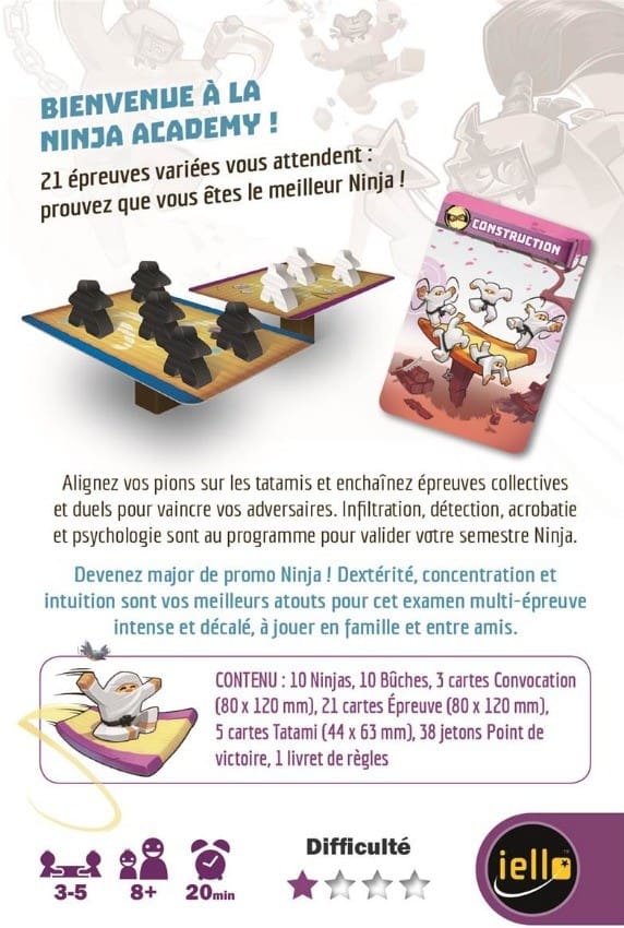 Ninja Academy combine finesse et humour dans une aventure ninja unique. Les joueurs seront confrontés à des épreuves hilarantes, devront empiler des ninjas, les lancer, les rattraper au vol, et même deviner leur nombre en secouant la boîte. Qui se révélera être le meilleur ninja de la Ninja Academy ? Laissez les fous rires et la compétition délirante commencer !