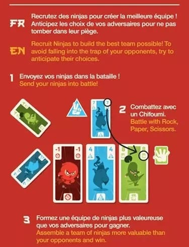 Comment ça marche ? Choisissez une carte Chaque joueur débute son tour en choisissant une de ses cartes. Attention : vous devez jouer toutes vos cartes au fil de la partie, alors réfléchissez bien à chaque choix. Révélez vos cartes Une fois que tout le monde a choisi, toutes les cartes sont révélées simultanément. La carte de la plus haute valeur déterminera qui commence le tour. La règle du pierre, feuille, ciseaux Utilisez cette règle pour récupérer une pile de cartes située au centre de la table. Votre carte remplace cette pile et vous permet d’ajouter ces cartes à votre collection. Objectif du Jeu Votre but est de recruter les meilleurs ninjas en accumulant le maximum de points de victoire. Anticipez les actions de vos adversaires et jouez vos cartes de manière stratégique pour voler leurs meilleures recrues. Votre plan sera-t-il parfait, ou serez-vous pris au dépourvu ? Le joueur (ou l’équipe) qui, à la fin de la partie, aura accumulé le plus de points de victoire, remporte la partie !