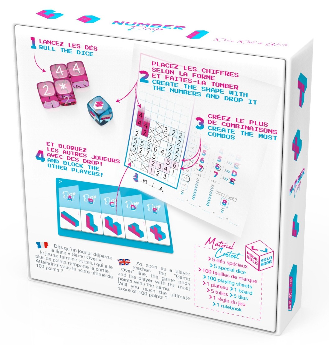 Description : A chaque tour, les joueurs doivent combiner les 5 dés pour créer une forme contenant les 4 chiffres. Il vont ensuite faire « tomber » cette forme dans leur grille, et essayer de la placer de manière à ce que les chiffres de toutes les formes soient organisés en suites de chiffres ou en séries de chiffres identiques. Valider des séries ou des suites permettra aux joueurs de marquer des points, mais aussi d’envoyer des Drop dans les grilles des adversaires pour contrer leurs plans. Qui sera le plus malin ?