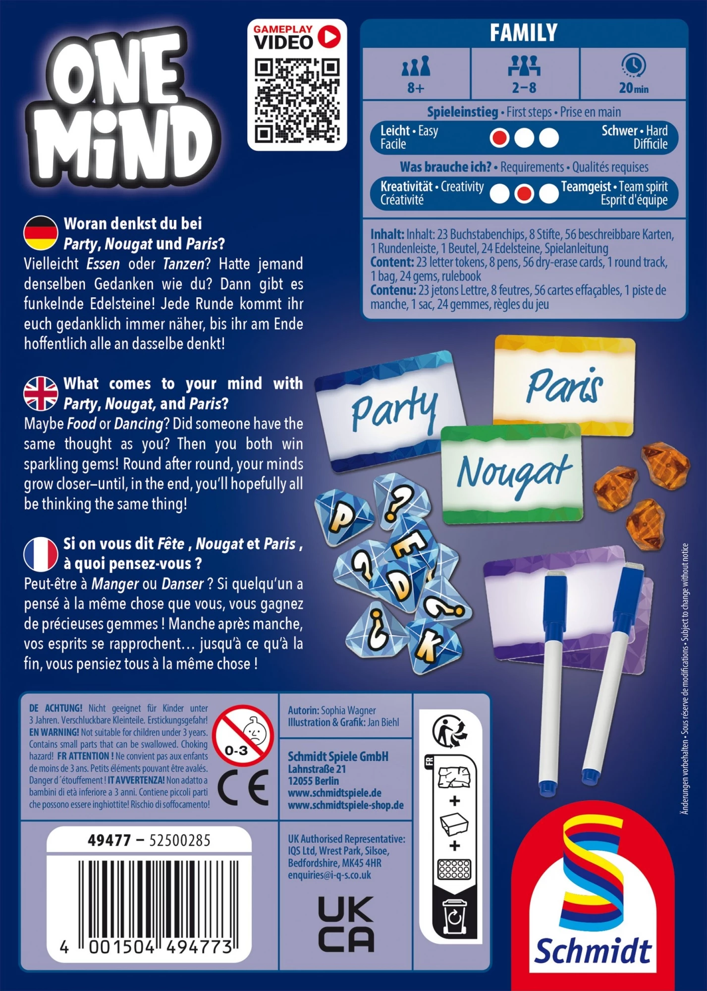One Mind est un jeu 100% coopératif qui mise sur l’intuition collective et la capacité à anticiper la pensée des autres. Plus la partie avance, plus les esprits se synchronisent et plus les associations deviennent évidentes… ou surprenantes ! Le jeu propose plusieurs niveaux de difficulté selon le nombre de gemmes en jeu, ainsi que des variantes pour renouveler vos parties.