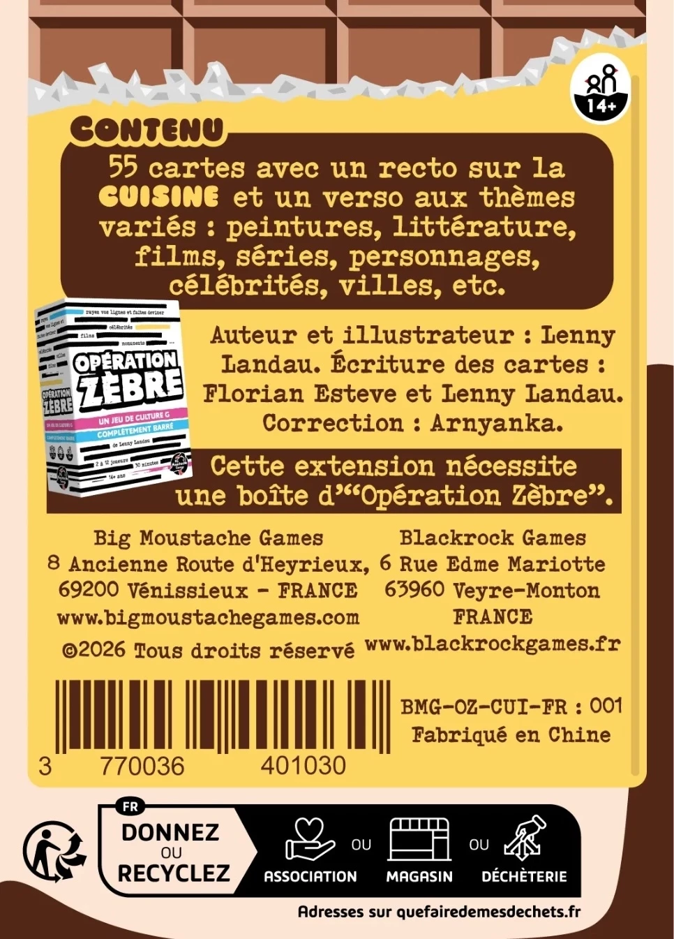 Simple à intégrer, l’extension Cuisine s’adresse aussi bien aux gastronomes qu’aux joueurs cherchant simplement à enrichir leurs parties d’Opération Zèbre avec de nouvelles thématiques.
