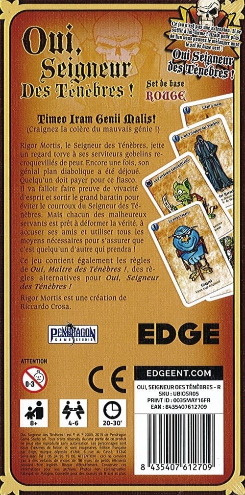 Plongez dans l’intrigue sombre et l’art de la tromperie avec Oui Seigneur des Ténèbres Rouge, où seul le plus rusé pourra échapper à la fureur du Seigneur des Ténèbres ! Que la bataille pour la survie et la suprématie commence dans ce jeu de société exaltant.
