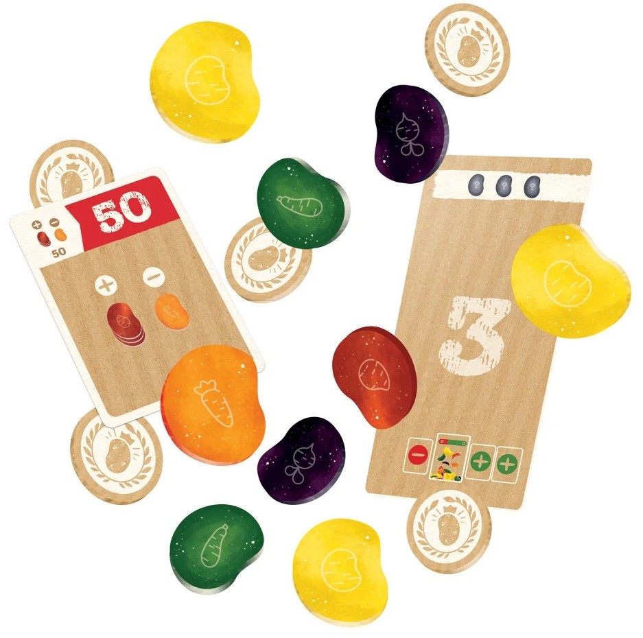 Paquet de Chips contient 25 chips de 5 couleurs différentes. Au début tous les joueurs reçoivent 6 cartes Objectif et la manche commence avec 4 étapes : on pioche d’abord 5 chips, puis 4, puis 3, puis 2 chips, et chaque joueur doit se défausser 1 ou 2 objectifs après chaque tirage.