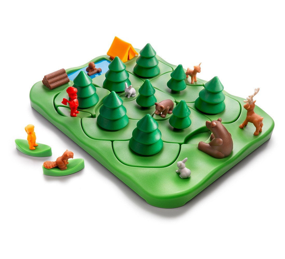 Faites tourner les sapins, petits et grands, pour déplacer les figurines des personnages et des animaux afin de les aider à rejoindre leurs parents ou leur habitat. Cependant, faites attention, seul l’ourson pourra approcher maman ourse sans danger ! Découvrez une subtile mécanique d’engrenages pour résoudre les 80 défis évolutifs du livret, de facile à difficile.