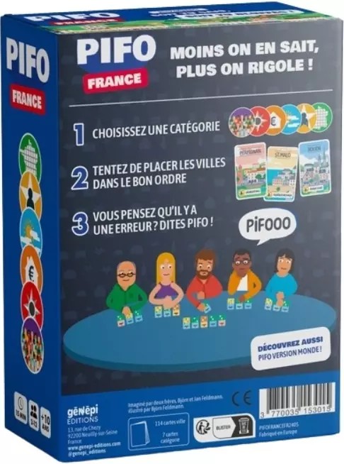 Comment se déroule une partie ? Distribution et Mise en Place Chaque équipe reçoit 7 cartes Villes, chacune représentant une ville française emblématique. Une carte Catégorie est placée au centre de la table. Celle-ci peut indiquer, par exemple, le prix au m², la population, ou tout autre critère de classement. Déroulement des Tours La première équipe débute en posant une carte Ville sur la table pour amorcer la frise chronologique ou l’ordre de classement. L’équipe suivante a alors le choix de confirmer l’ordre (en acceptant la carte et en prenant la responsabilité de la suite) ou de crier « PIFOOO » pour vérifier si la carte est bien placée selon le critère défini. Si l’ordre est validé, l’équipe doit alors jouer une nouvelle carte Ville pour poursuivre la construction de la frise. Sinon, la carte est révélée, et l’équipe qui s’est trompée pioche 2 cartes en pénalité. Le Twist Final Lorsqu’une équipe se retrouve avec sa dernière carte, elle doit non seulement la jouer, mais aussi donner le gentilé de la ville (le nom des habitants). Ce petit détail mettra à l’épreuve vos connaissances sur la culture locale et récompensera l’expertise. Pourquoi Jouer à Pifo France ? Un défi de stratégie et de rapidité : Placez vos cartes judicieusement et gérez votre main pour être le premier à vous en défaire. Culture et savoir-faire : Testez vos connaissances sur la géographie et la culture française, tout en vous amusant. Ambiance conviviale : Parfait pour des soirées en équipe, où l’interaction et le bluff rythment la partie. Rejouabilité : Chaque partie est différente grâce aux multiples villes et aux catégories variées, renouvelant sans cesse le défi. Pifo France vous permet de voyager à travers la France sans quitter votre salon, en combinant habilement stratégie, culture et amusement. Alors, prêts à relever le défi et à prouver que vous êtes les experts de la géographie française ? À vos cartes, et que le meilleur connaisseur l’emporte !