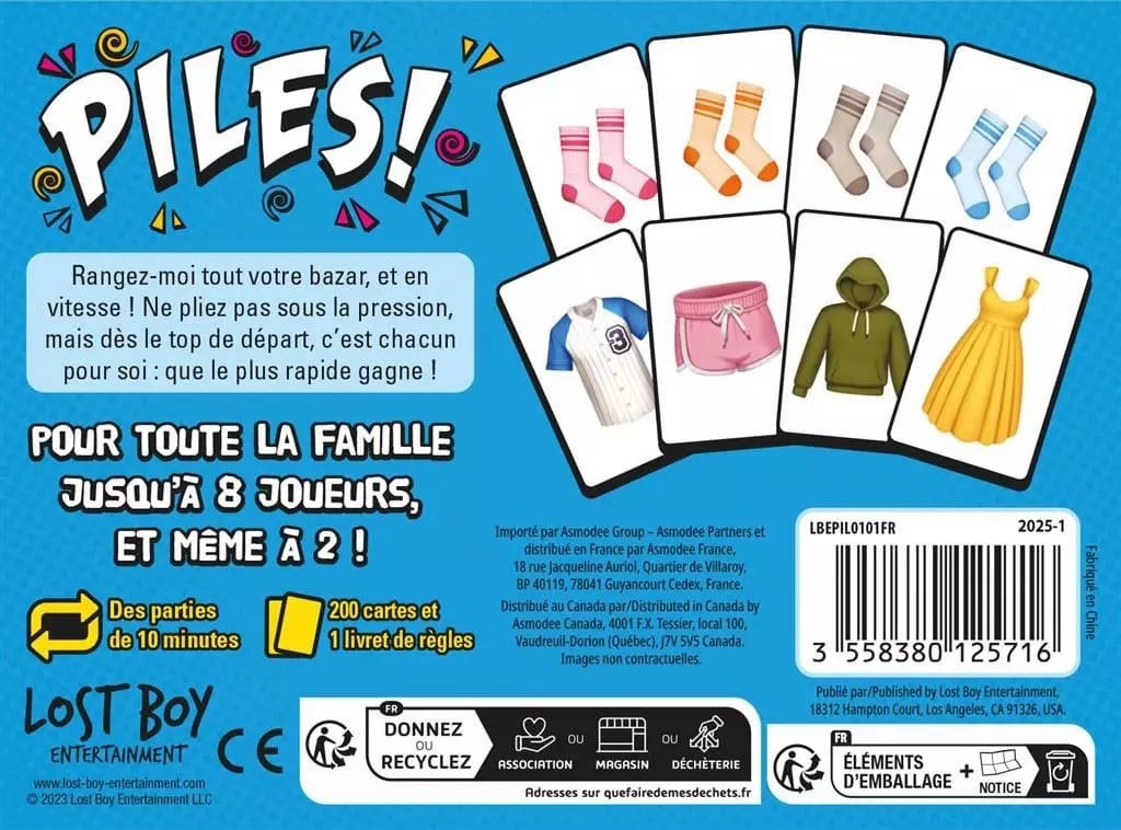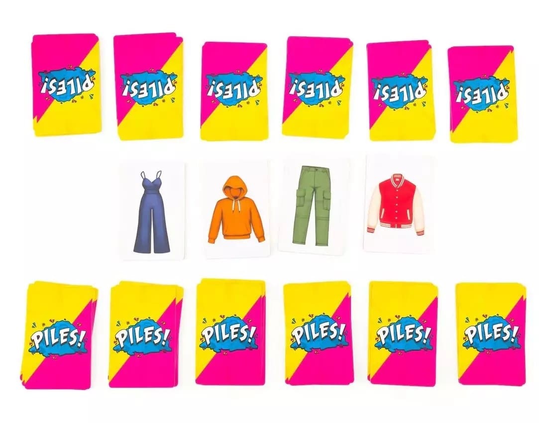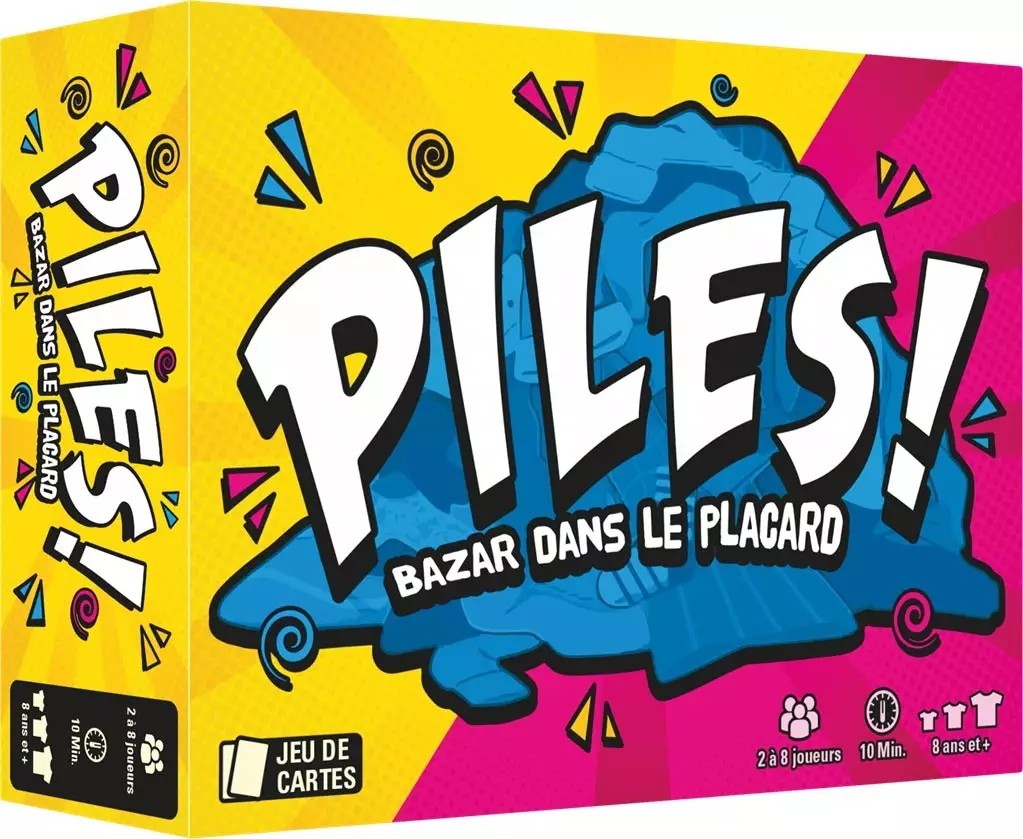 Piles! Un joyeux bazar… à trier à toute vitesse ! Dans Piles!, tout le monde joue en même temps pour faire le tri dans un capharnaüm de vêtements éparpillés. Pulls, chaussettes, pantalons… à vous de reconstituer des séries parfaites avant les autres !