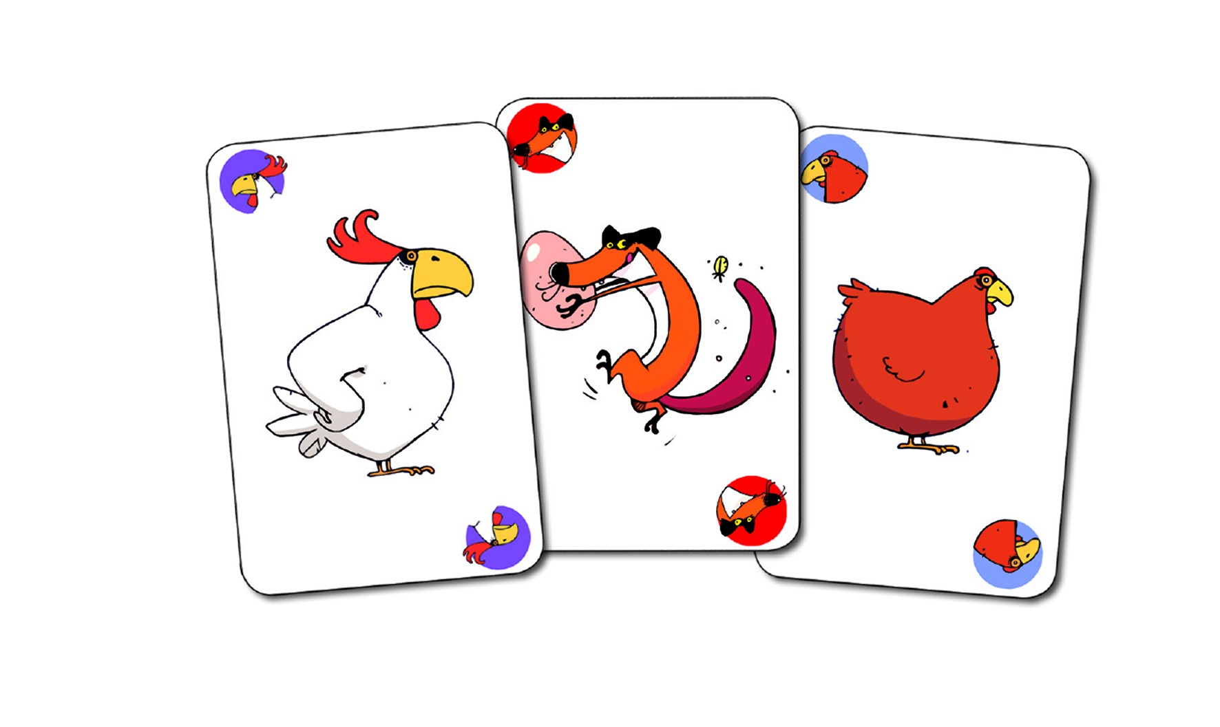 La boite de jeu contient 47 cartes (6 renards, 15 coqs, 15 poules, 11 nids), 18 oeufs/poussins et la règle du jeu en 10 langues.