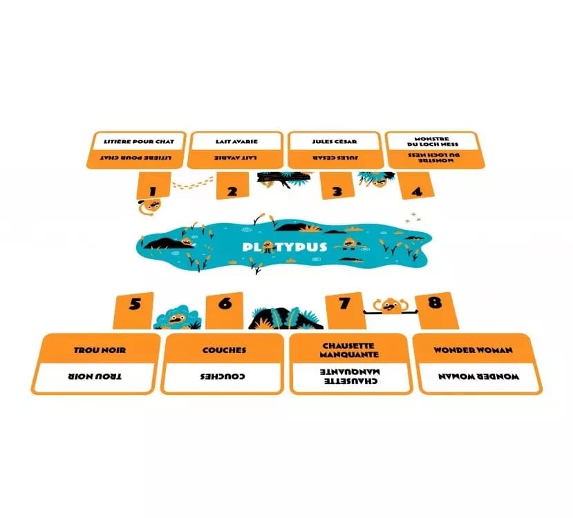 Dans Platypus, certains joueurs sont des Guides, chargés de faire deviner un nom aux Explorateurs. À chaque manche, les Explorateurs doivent éliminer progressivement les mauvais noms à l’aide des indices fournis par les Guides, jusqu’à ne laisser visible que le nom à deviner.