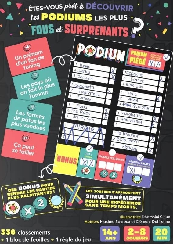 Podium est un jeu d’ambiance créé par Jérémie Caplanne et édité par Djeco. Il est parfait pour jouer en famille ou entre amis. Le but du jeu est de recréer des poses en utilisant des silhouettes imprimées sur des cartes.