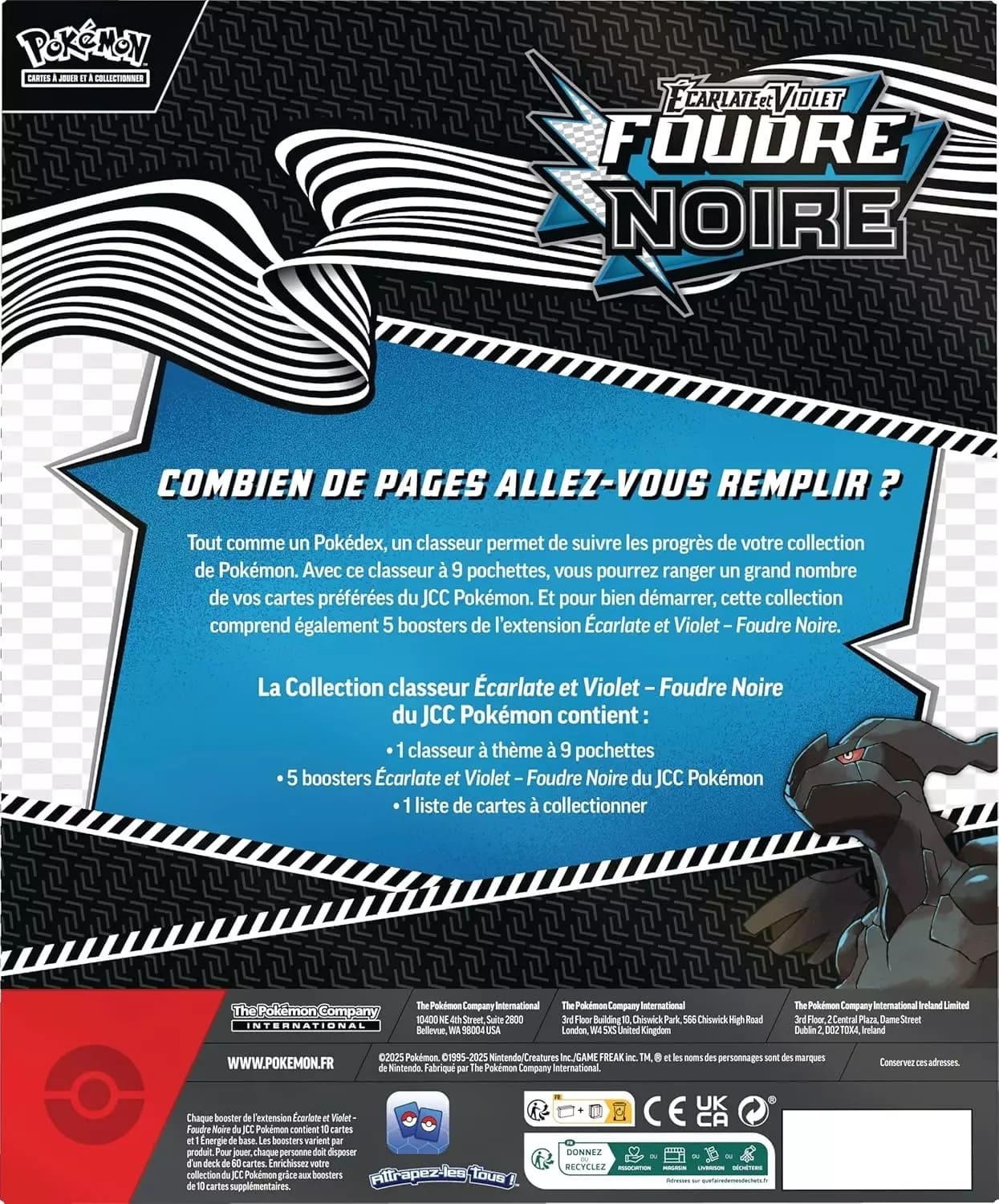 1 classeur à thème à 9 pochettes ; 5 boosters Écarlate et Violet – Foudre Noire ou Écarlate et Violet – Flamme Blanche du JCC Pokémon ; 1 liste de cartes à collectionner. Les Collections classeur Écarlate et Violet – Foudre Noire et Écarlate et Violet – Flamme Blanche du JCC Pokémon seront disponibles le 18 juillet 2025 dans les points de vente des produits du JCC Pokémon.