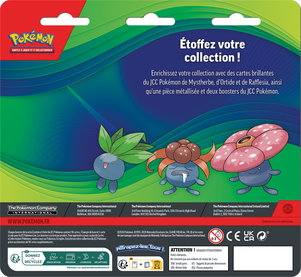Enrichissez votre collection avec des cartes brillantes du JCC Pokémon de Mystherbe, d’Ortide et de Rafflesia, ainsi qu’une pièce métallisée et deux boosters du JCC Pokémon.