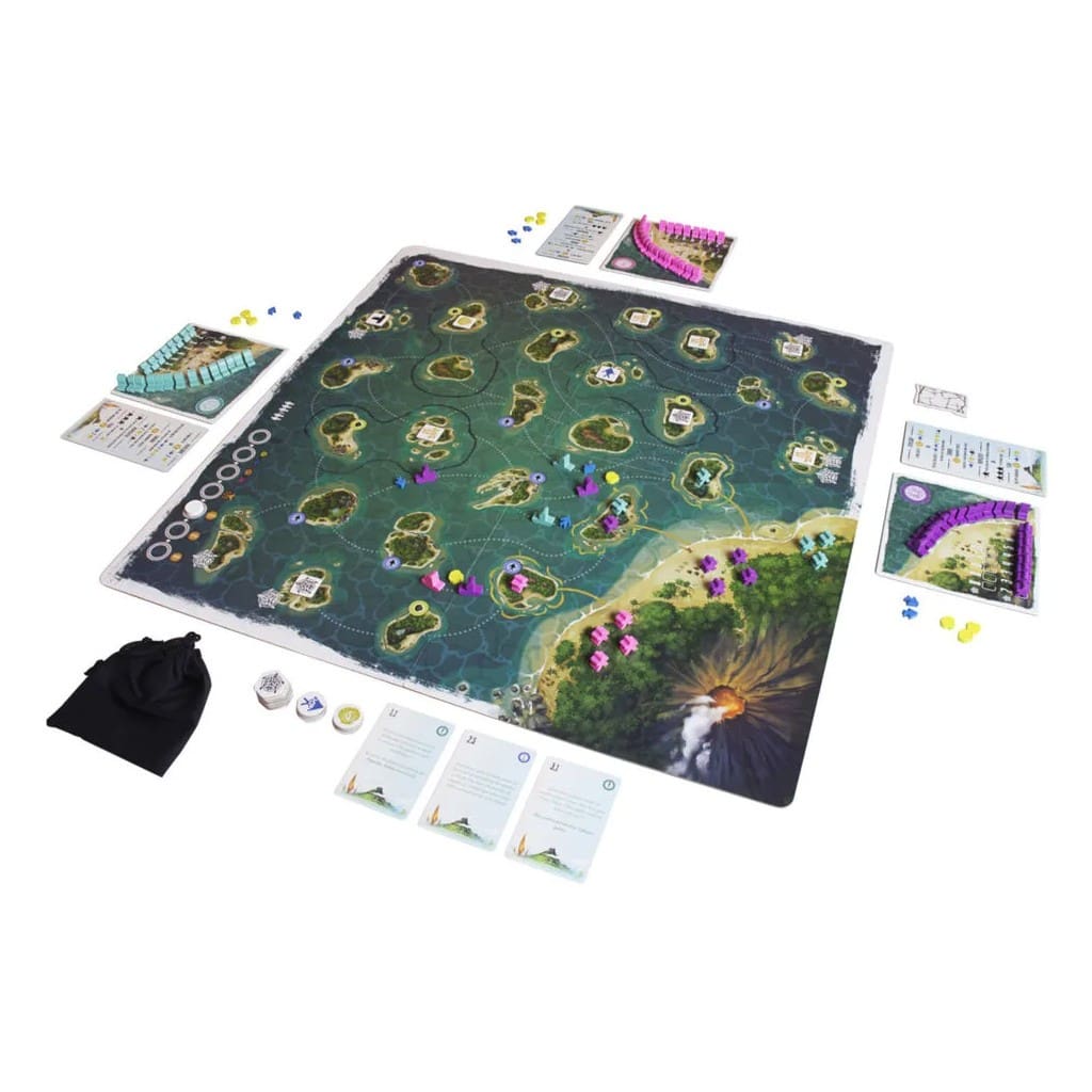 La terre tremble, le ciel s’assombrit au-dessus du cratère : une odeur persistante de soufre vous prend à la gorge. Il est temps de fuir. Menez votre tribu dans les eaux du Pacifique à la recherche de votre nouveau domicile, loin de la menace du volcan.