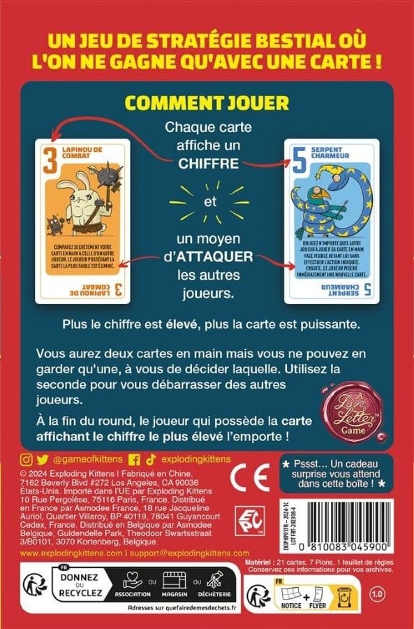 Comment ça marche ? Chaque joueur reçoit deux cartes au début du tour mais ne peut en garder qu’une. La carte que vous choisissez de défausser devient votre arme pour attaquer les autres joueurs et les affaiblir. Mais attention, il vous faudra choisir sagement : chaque carte a une valeur et un pouvoir spécial, et plus sa valeur est élevée, plus son effet est redoutable !