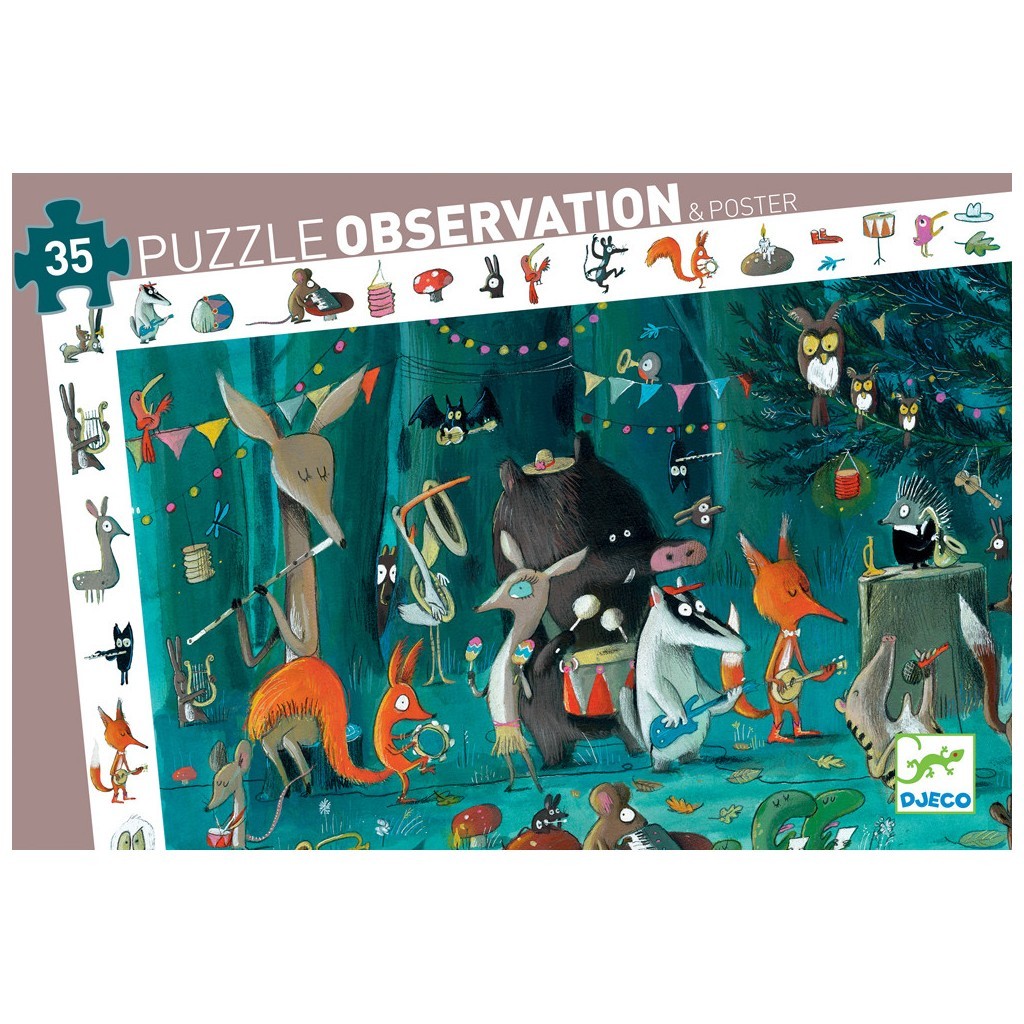 Découvrez le puzzle d’observation l’orchestre de Djeco, un puzzle de 35 pièces pour les enfants dès 3 ans. Votre enfant va créer son puzzle puis retrouver dans l’image les éléments de la frise. Un puzzle représentant une forêt dans laquelle les animaux jouent de la musique, vous y trouverez un renard jouant de la guitare, un hérisson jouant de l’accordéon, un lapin jouant du violon… Il pourra également accrocher le poster du puzzle au mur de sa chambre ou s’en servir pour s’aider dans la réalisation du puzzle. Un puzzle de qualité à faire et à refaire à volonté.