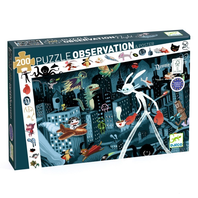 Découvrez le puzzle d’observation Night City de Djeco, un puzzle de 200 pièces pour les enfants dès 6 ans. Votre enfant va créer son puzzle, puis il va s’amuser à retrouver dans l’image les éléments de la frise. Un puzzle représentant une ville de nuit, où voltigent de drôles de personnages. Un bel univers à découvrir à travers une illustration riche en détails et en surprises. Votre enfant pourra également accrocher le poster du puzzle au mur de sa chambre ou s’en servir pour s’aider dans la réalisation du puzzle. Un puzzle de qualité à faire et à refaire à volonté.