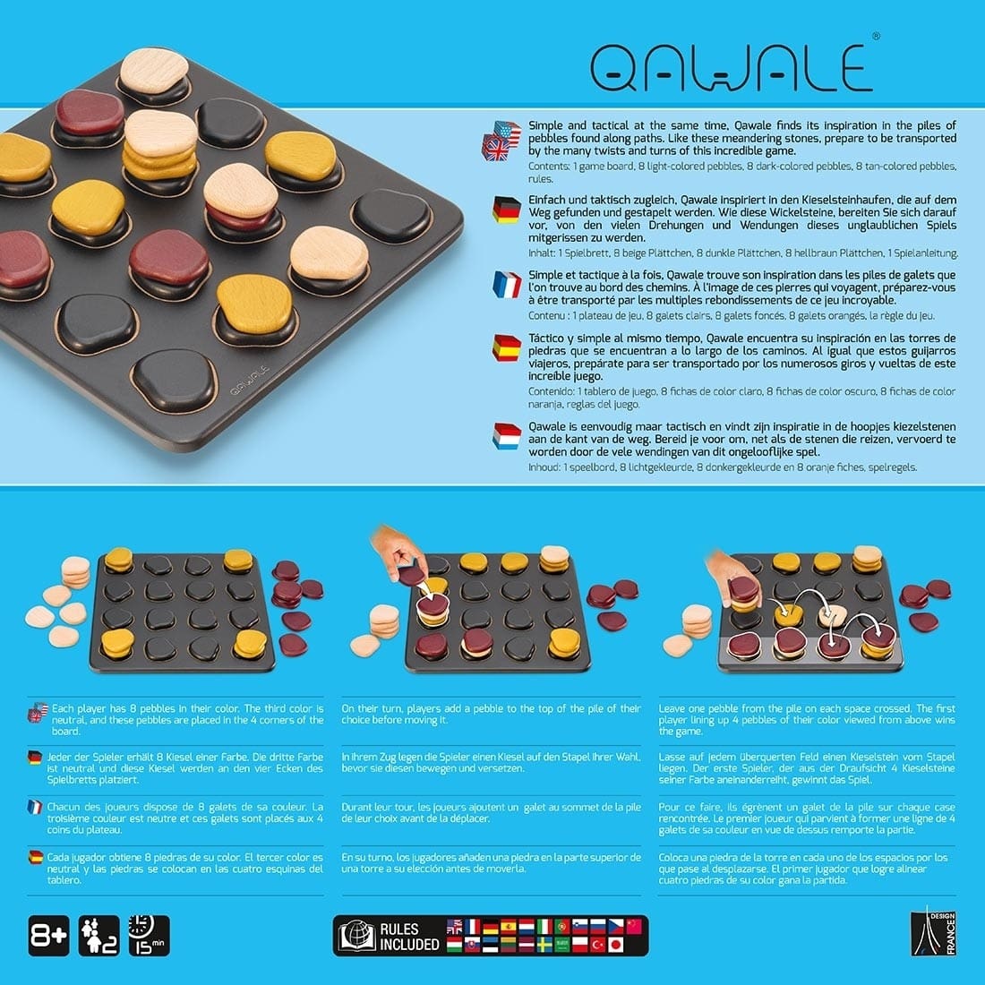 Embarquez pour une aventure de réflexion et de tactique avec Qawale Mini, un jeu abstrait inspiré par les piles de galets que l’on trouve au bord des chemins. Dans ce jeu captivant pour deux joueurs, vous devrez faire preuve de stratégie et d’ingéniosité pour placer vos galets sur le plateau et former une ligne de 4 galets de votre couleur avant votre adversaire.