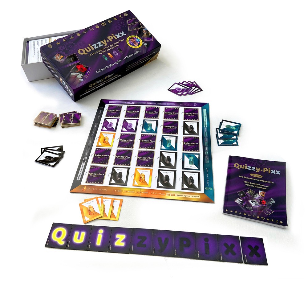 QUIZZYPIXX est un jeu d’ambiance combinant astucieusement identification visuelle, quizz classique, stratégie et mémorisation. Choisissez votre gemme préférée parmi onyx noir, ambre jaune, améthyste et aigue marine.