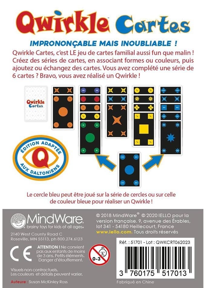 Qwirkle Cartes est conçu pour être accessible à tous les membres de la famille, des enfants aux adultes. Ses règles simples et son gameplay intuitif en font un jeu idéal pour les réunions familiales, les soirées jeux entre amis ou même pour jouer en voyage.