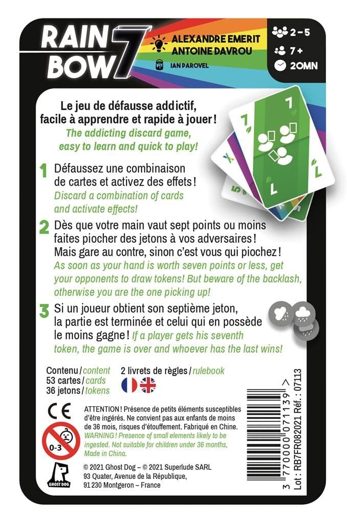 Plongez dans l’univers coloré et captivant de Rain Bow 7, où la stratégie, la rapidité d’esprit et un peu de chance sont les clés de la victoire. Évitez les jetons Pluie à tout prix et montrez votre habileté dans ce jeu de cartes passionnant !