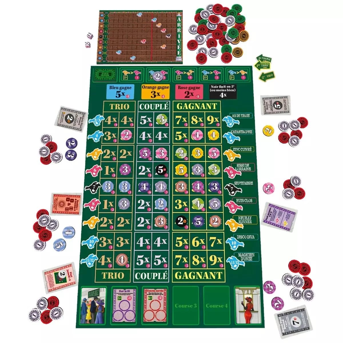 ? Un jeu de tactique et d’ambiance Le jeu se déroule en 4 courses, chacune apportant de nouveaux paris à découvrir. À la fin de chaque course, les gains (ou les pertes !) sont calculés. Les meilleurs parieurs obtiennent aussi des cartes VIP, de puissants avantages pour les courses suivantes. Après 4 manches, le joueur ayant accumulé le plus d’argent est déclaré roi du turf !