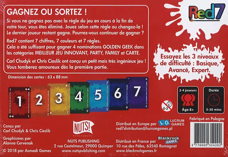 Red7 est composé de 7 couleurs ayant chacune 7 cartes dont les valeurs vont de 1 à 7. Chaque couleur a une règle. Exemples : Rouge : la carte la plus élevée gagne, Bleu : le joueur ayant le plus de cartes d’une même couleur gagne, …