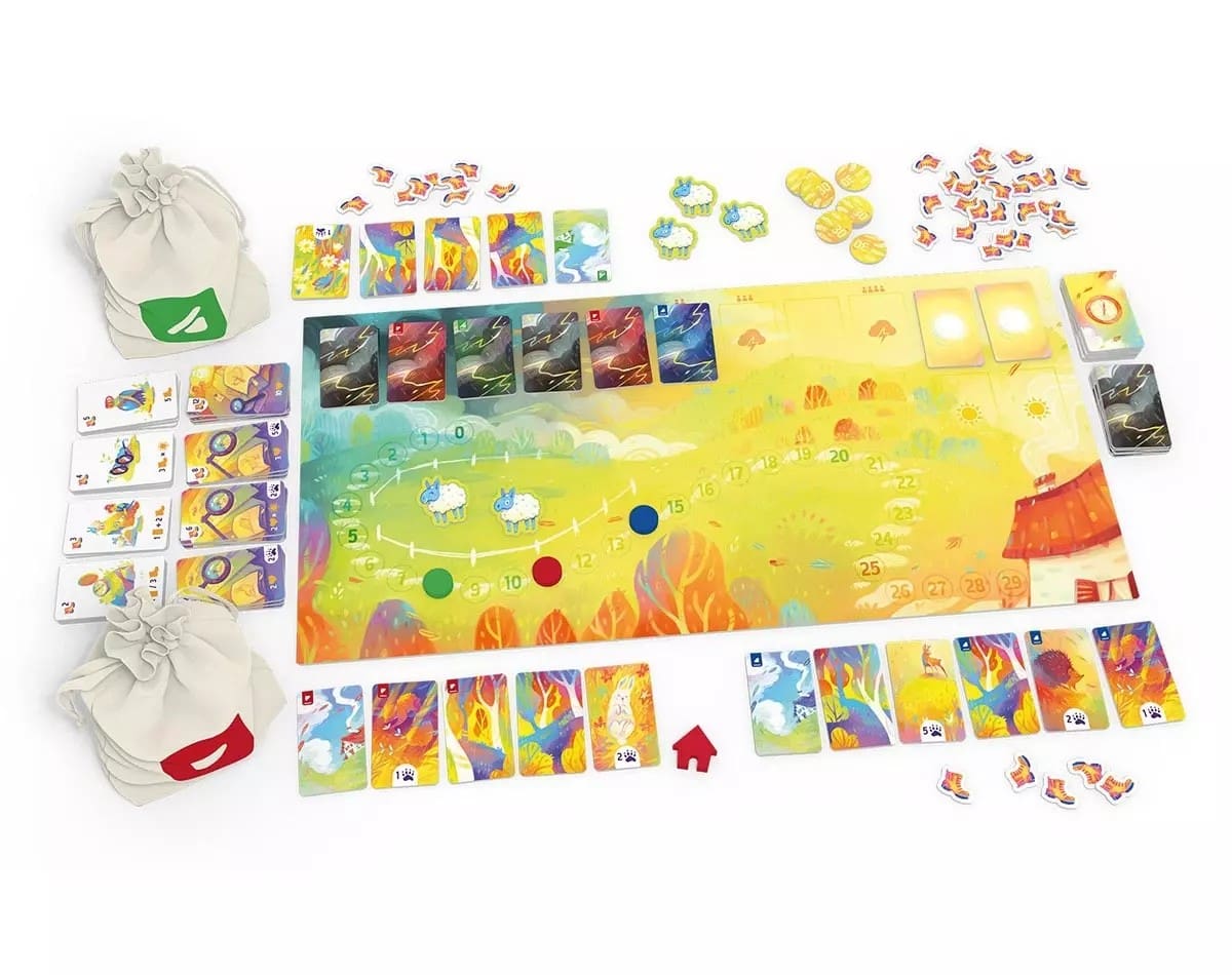 Créez votre balade en piochant des tuiles dans votre sac. Ajoutez-en aussi de nouvelles. Lesquelles allez-vous glisser dedans ? C’est à vous de choisir : objets utiles, magnifiques paysages à visiter ou animaux à observer ? Mais surveillez bien la météo, la tempête se rapproche. Lors d’une partie, vous allez faire 5 balades. Chacune se compose d’un nombre de tours au cours desquels vous piochez en même temps deux tuiles dans votre sac et en placez une devant vous. L’autre retourne habituellement dans votre sac. De tour en tour, vous formez ainsi votre balade jusqu’à ce que vous décidiez de rentrer ou que vous soyez surpris par la tempête. En effet, si des tuiles tempête sont piochées, elles sont ajoutées à la piste météo, s’il y en a trop, les promeneurs sont surpris et ne gagneront pas les points donnés par les animaux qu’ils ont croisés sur leur parcours. Un petit côté stop ou encore dans un paysage bucolique et apaisant ! Mais durant votre balade, achetez de nouvelles tuiles à mettre dans votre sac pour améliorer vos parcours et récolter le plus de points possibles.