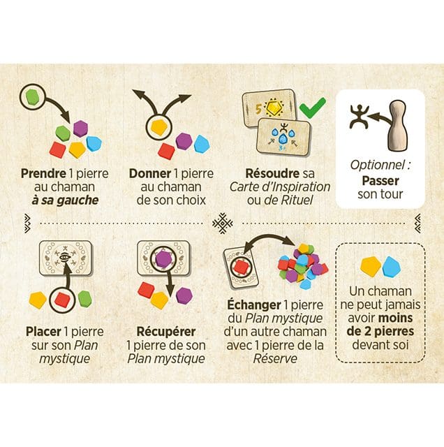 À chaque tour, un joueur effectue une action parmi sept disponibles, mais sans aucun échange verbal ou gestuel. Chaque décision doit être interprétée à la lumière du contexte, poussant à une coopération intuitive et sincère. L’objectif : synchroniser les efforts du groupe pour récolter les bonnes pierres et franchir ensemble les six étapes du rituel avant la fin du temps.